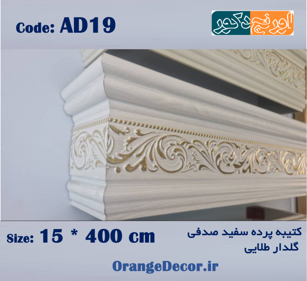 کتیبه پرده پلی استایرن روکش پی وی سی سفید صدفی گلدار طلایی ۱۵ سانت طول ۴ متر کد K16-E1-227T